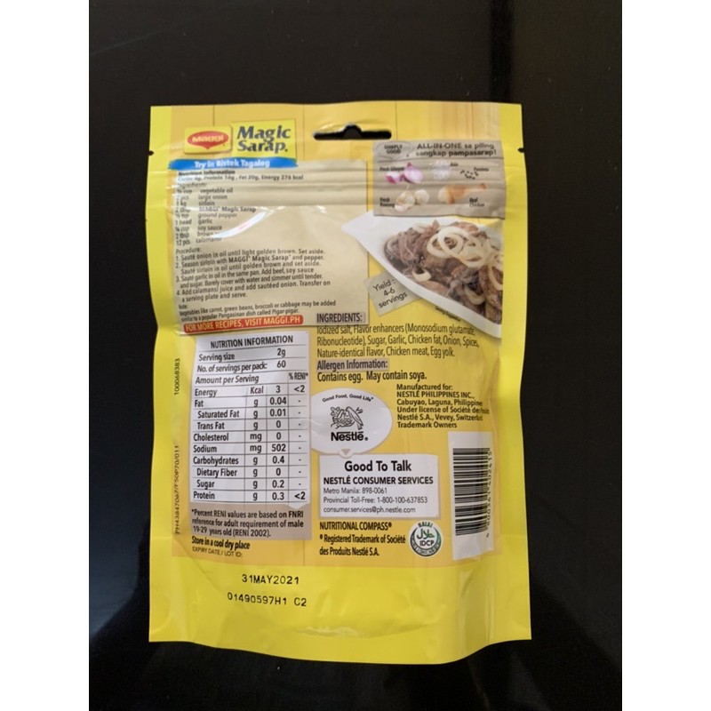 This Maggi Magic sarap seasoning granules is available in market it was manufactured in. Makes use of our proprietary 4G Granulation technology that ensures the overall flavour enhancement with fresh spices. Iodized salt monosodium glutamate MSG sugar chicken fat flavor enhancer garlic onion spices natural and nature-identical flavors gluten egg.